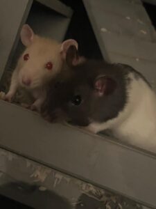 Pinky and Cerebro enjoy mazes and memory tasks. They are a bit nervous being around all these cats.